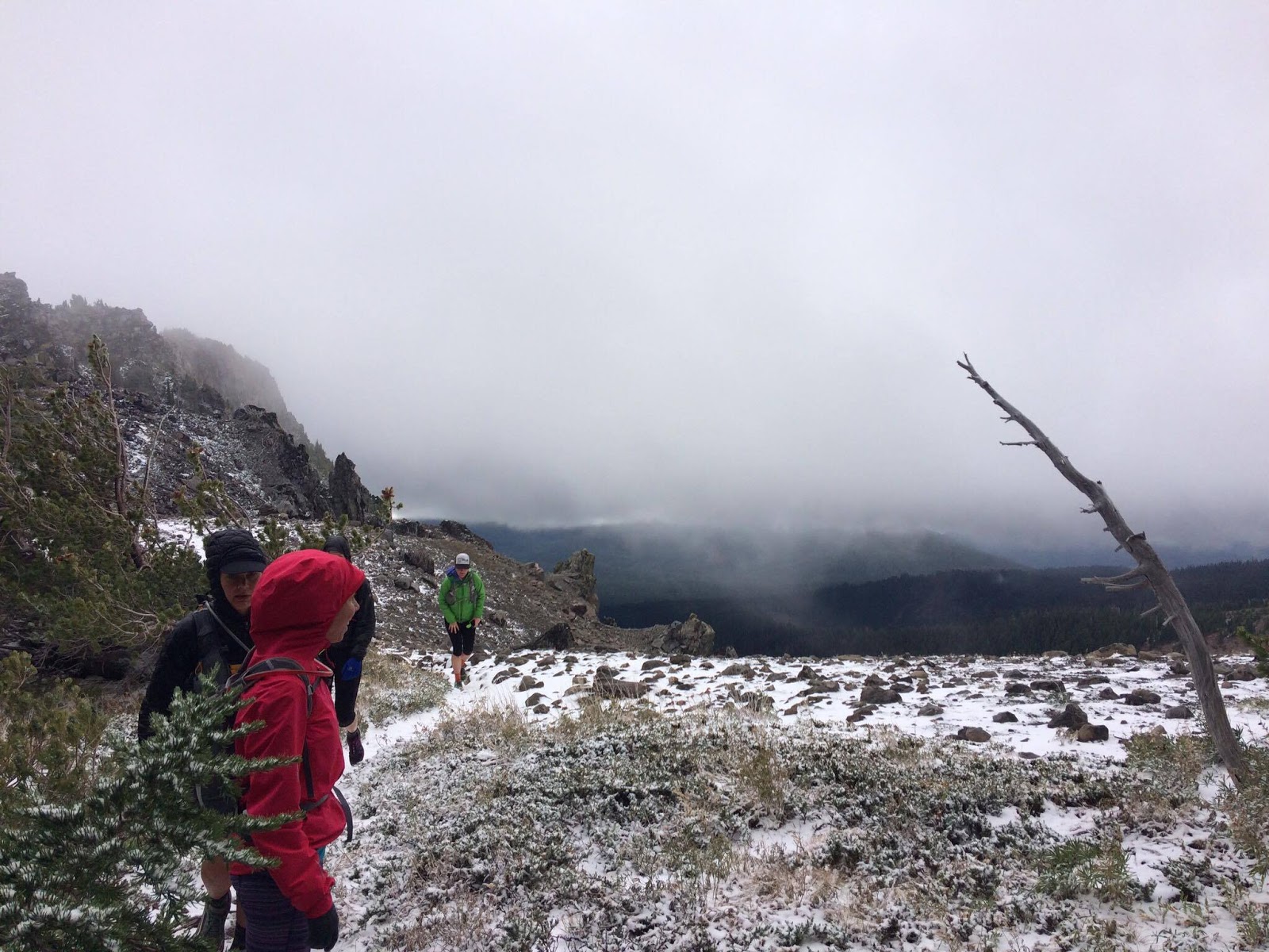 Gnarl ridge is named for the twisted, ancient whitebark pines that grow in this harsh, exposed environment - but on our journey, the name was also quite appropriate to the conditions we experienced there. Being the highest elevation (about 6800 ft/2000m) that Timberline travels through, and very exposed, as soon as we crested the ridge we were greeted with swirling, pelting snow pellets and high winds that actually blew me off my course with each step. We pushed our way toward a tiny copse of trees and were amazingly sheltered behind them (thanks, gnarly pines!), and quickly stopped to put on extra layers - at this point I was wearing pretty much everything I had brought, including a long sleeved Merino wool shirt, a puffy jacket, a shell, and my toque and gloves. We discussed our concern that if these conditions persisted, it may not be safe to continue and we should probably turn around, but Tara knew that this was where we were topping out and that we would soon be descending the other side of the ridge, so we decided to keep moving forward and take stock a little further on. Sure enough, once we were on the other side of the ridge we slowly moved out of the snow and wind, and never saw those conditions again for the rest of the day. This cemented in our minds that our counter-clockwise route was the best decision, at least on that day - navigating that terrain near the end of our run when we were exhausted and wet would have been quite dangerous.